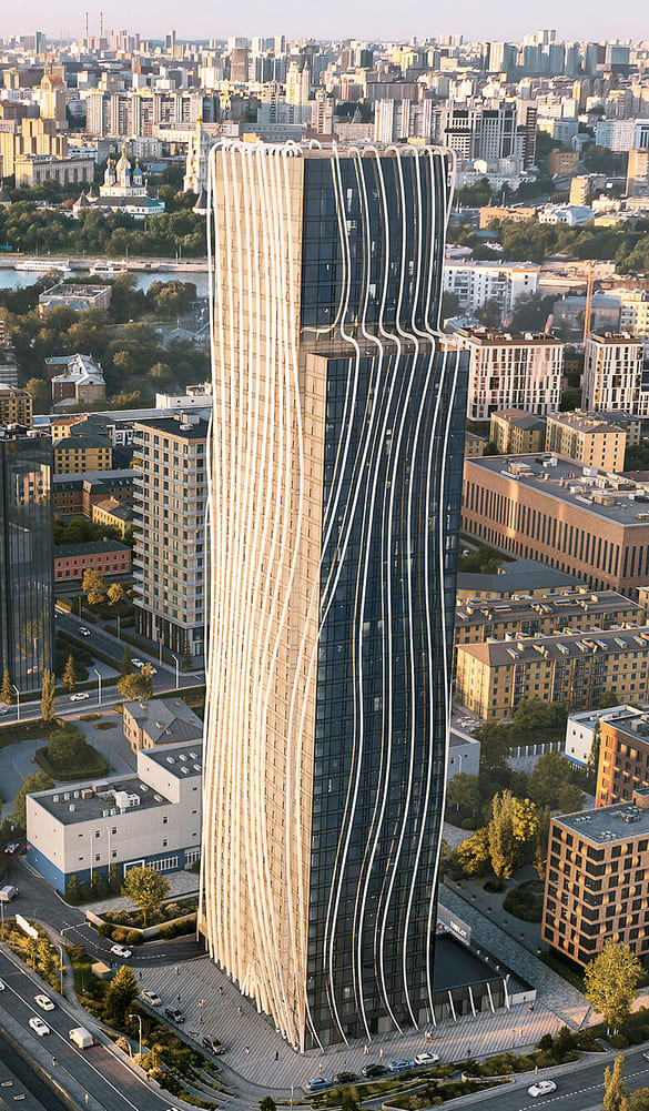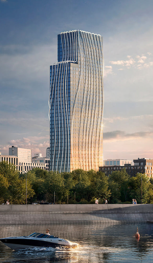 Архитектуру THE LOT создало бюро APEX — это одна из немногих московских башен, где фасад опоясан динамичными ламелями-лентами из анодированного алюминия, формирующими пластичный, волнообразный силуэт. Такой архитектурный приём считывается как визуальный акцент и увеличивает узнаваемость проекта